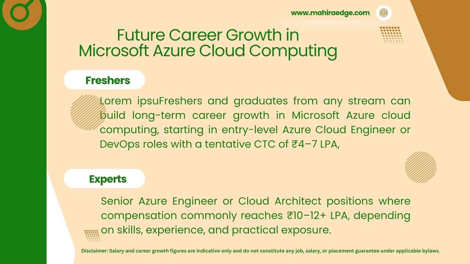 Freshers and graduates from any stream can build long-term career growth in Microsoft Azure cloud computing, starting in entry-level Azure Cloud Engineer or DevOps roles with a tentative CTC of ₹4–7 LPA, and progressing to senior Azure Engineer or Cloud Architect positions where compensation commonly reaches ₹10–12+ LPA, depending on skills, experience, and practical exposure.